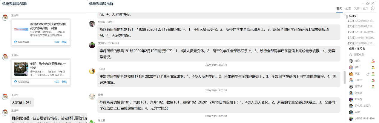 在防控知识教育和正能量传播方面,机电工程系密切关注官方疫情信息及四川省委、绵阳市委战略部署,掌握疫情防控工作的最新形势和相关知识,严格落实公司及相关部门各项决策部署,及时通过QQ群、微信群、电话将最新政策通知师生,也动员师生向身边亲友宣传,一起做好防护,提高防护意识。2月5日起至2月10日,系“战疫”领导小组组织全体辅导员带动班级员工学习由教育部思政司牵头举办的“老员工心理应激与应对”系列培训,并就疫情心理应激管理与自助、在延长的假期中做些什么、老员工积极心态建设等主题进行讨论,并针对疫情给同学们造成的心理压力进行疏导。