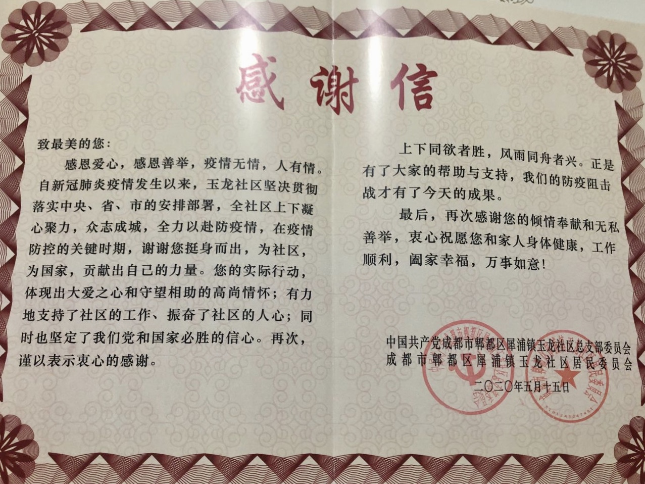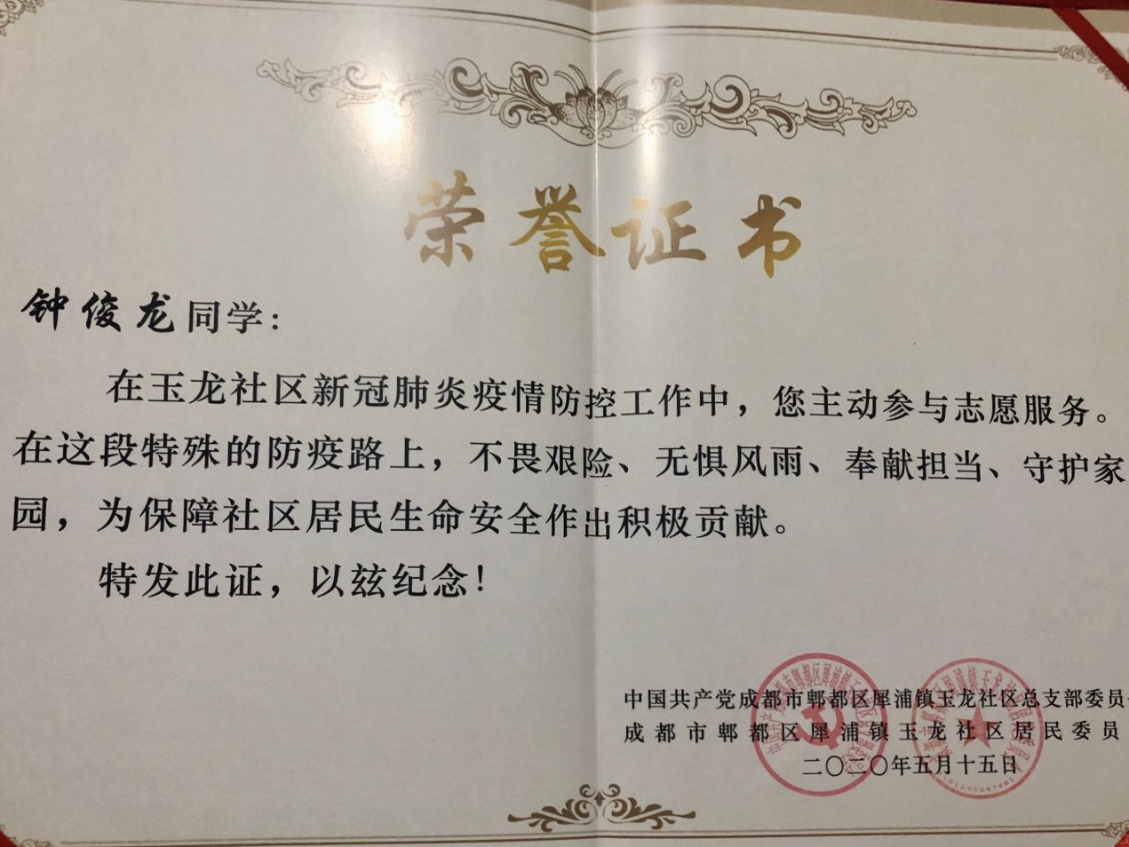 近日,我系员工入党积极分子钟俊龙收到中国共产党成都市郫都区犀浦镇玉龙社区总支部委员会、成都市郫都区犀浦镇玉龙社区居民委员会的感谢信和荣誉证书,为钟俊龙在疫情防控关键时期挺身而出,贡献自己的力量进行感谢和表扬。