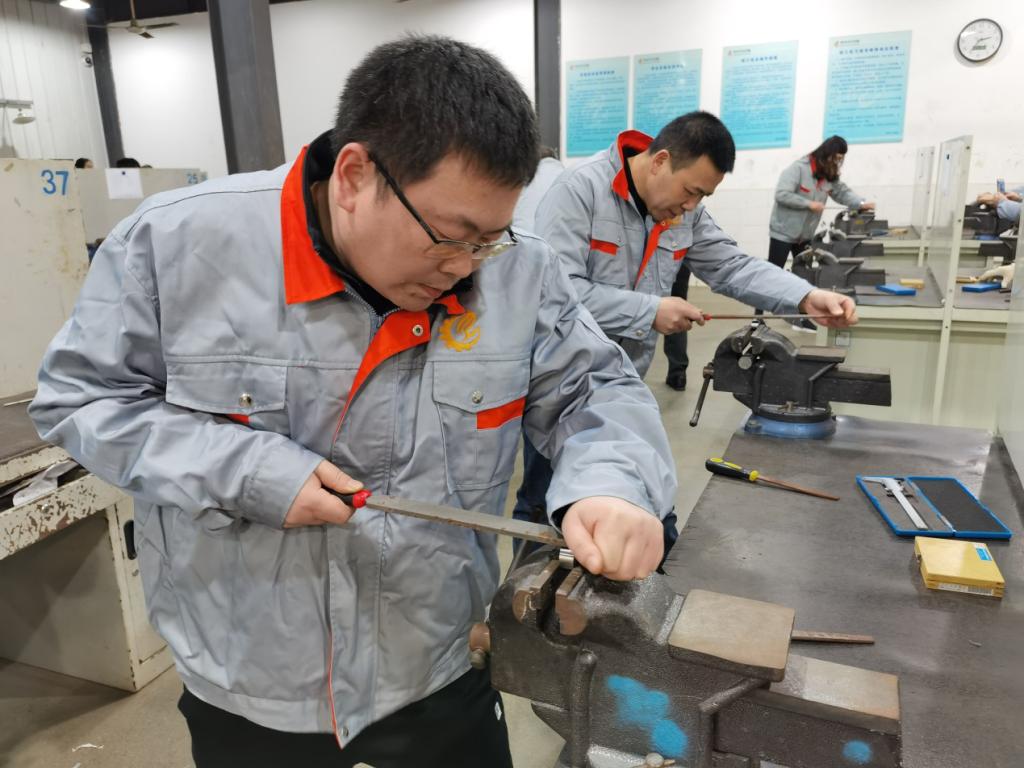 比赛开始,颜宏老师对参赛选手进行了钳工技能培训,详细讲解了钳工锉削及钻孔等工艺,并就加工过程中的操作规范和注意事项做了重点示范教学。随后,参赛选手们在车间进行激烈比拼,运用钳工技能按要求完成操作作业。
